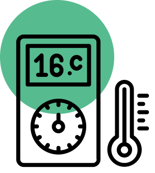 Icon of a thermometer with a snowflake and down arrow inside a green circle.